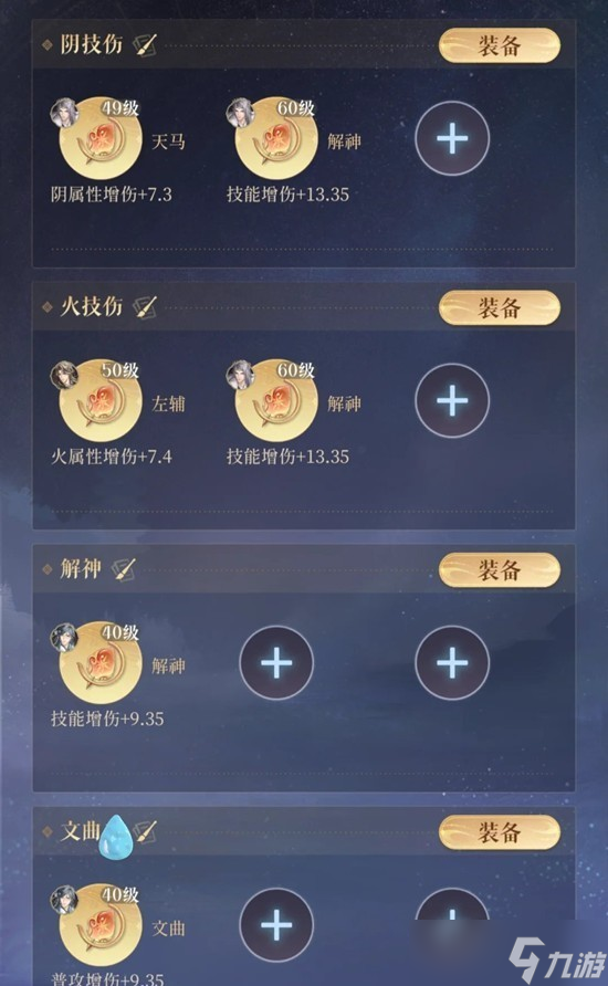 虞翻:虞翻的所有技能以及对方存在偃甲-袖剑的普攻,全部属于“偃甲伤害”不属于技能伤害,因此虞翻不需要带文曲和解神,如果需要开辅星只需带“天马+三台”