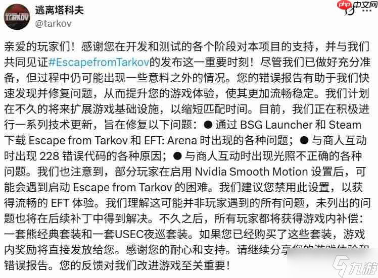 BSG启动器及Steam平台在下载《逃离塔科夫》与《EFT:竞技场》时出现的异常状况;与商人互动过程中频繁触发的228错误代码及其多种成因;商人交易界面中存在的光照显示异常问题。此外,官方已向所有玩家发放游戏内补偿奖励,对于已自行获取相关物品的玩家,系统将自动将其兑换为等值的游戏内资源。