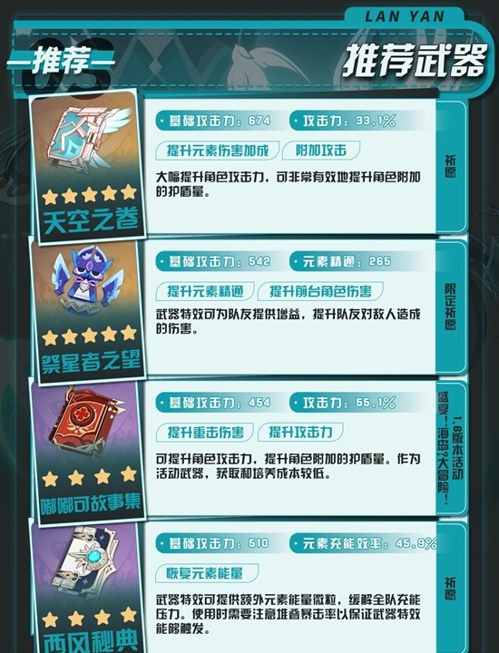 最后:以上是心愿游戏小编为您收集的原神月之二版本角色培养攻略 角色蓝砚怎么培养分享,希望能帮到小伙伴们,更多相关的文章请收藏心愿游戏