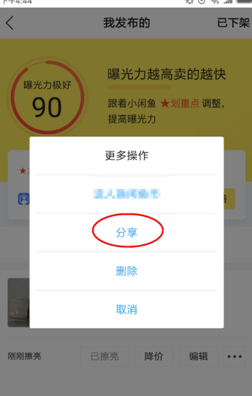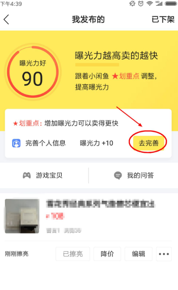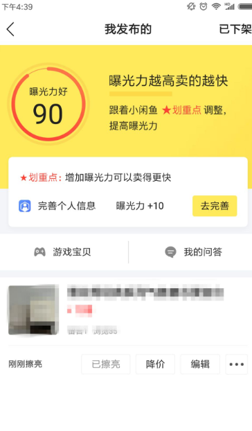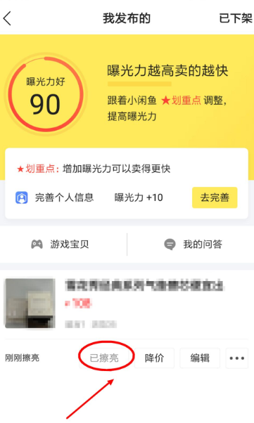 找到个人的商品,并点击擦亮,一次擦亮可以加5个点的曝光力。