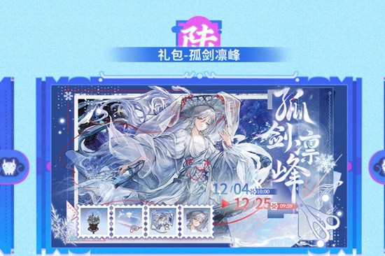 12月4日10:00至12月25日09:59,购买礼包可获得雪景寒林图系列新装-孤剑凛峰,以及专属点动作、专属着装背景等。