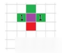 5×5的方格,假设紫色格一开始是暗的,我的目标是把它点亮,而前两行点下的位置已经确定(如图中的1),那么由于紫色格的状态只与自身以及周围4个点被按下次数有关(总和应是奇数),而绿格和紫格累计被按下2次,所以在第3行,红色格必须被按下。