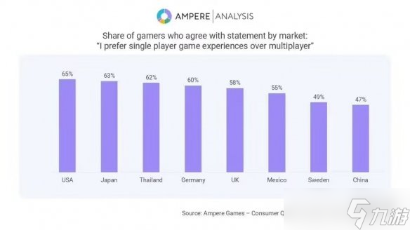 该项调查覆盖全球22个市场、共34,428名玩家。数据显示,偏好单人游戏的玩家比例在日本达到63%,美国为65%,英国为58%,泰国和德国也分别达到62%与60%。相比之下,中国玩家中仅有47%偏好单人游戏,瑞典为49%,荷兰则基本持平,比例为50%。