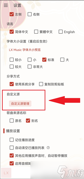 3.进入设置页面后向下滑动,找到自定义源选项并点击其中的管理按钮。