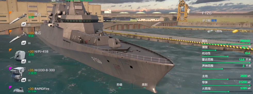 F126型护卫舰则以其强大的火力输出而闻名,它所配备的火箭炮在战斗中展现出了一定的威力,可以在输出的时候利用多炮火攻击的优势给对手造成压力,当与A22型火箭相互搭配时,其在近战场景下的表现更是得到很大提升,能够对靠近的敌人展开连续的火力打击,此外该舰自身还拥有较高的血量上限,在激烈的交火中能够承受住敌人的多次攻击,正因如此,如果玩家想要采取近距离冲锋突击的战术打法,F126型护卫舰是最为合适的选择。