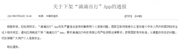 据《人民日报》7月4日报道,国家网信办公布消息,根据举报,在进行检测核实后,滴滴出行App存在严重问题,违法收集使用个人信息,依法下架整改。