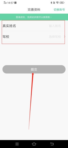4、最后再输入真实姓名以及驾校,点击“提交”,这样我们就成功的注册账号了。