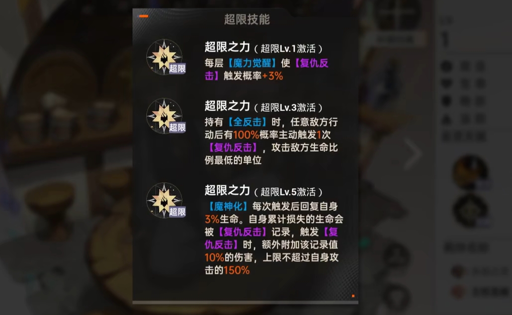 每次行动结束后,梅利奥达斯还能通过被动技能“深渊贯穿”积累一层“魔力觉醒”。每层均可提升全属性,当累计达到五层时,触发“魔神化”状态。进入此形态后,其每次攻击附带真实伤害,并在受到攻击时有一定概率进行反击,该反击效果与全反击独立计算,可同时存在。完成超限突破后,不仅能提高反击触发几率,还可解锁主动追击能力——在拥有全反击状态下,对已完成行动的敌人额外发动一次反击。同时,魔神化期间还将获得生命回复效果,极大提升了续航与战场适应能力。
