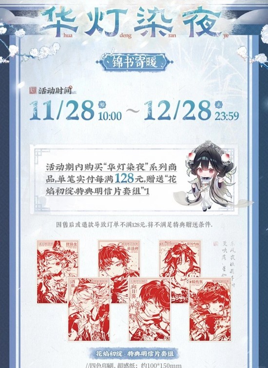 ③.预售期间购买“华灯染夜”系列产品,单笔实付满128元,赠送“花焰初绽·特典明信片套组”*1。