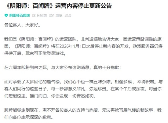 公告显示,停止更新决定源于公司运营策略调整。运营团队在公告中表示:"非常遗憾地告诉大家,因运营策略调整的原因,《阴阳师:百闻牌》将在2026年1月1日之后停止新内容的开发。"不过,官方同时承诺游戏服务器将继续保持开放,玩家仍可正常登录游戏。