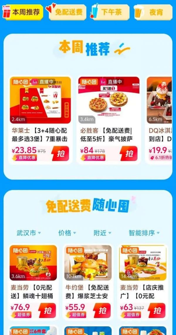点击“抢购”,会进入到“随心团”页面。页面内除了显示本周推荐的活动商品,还有下午茶、夜宵等分类下的商品,部分商品支持免费配送。