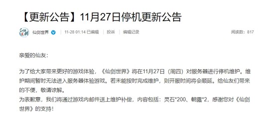 时间:2025-11-28 | 作者: | 阅读:0仙剑世界11月27日停机更新?相信有很多的用户还不明白仙剑世界,下面由心愿游戏小编为您介绍一下吧,跟小编一起来看看哦。