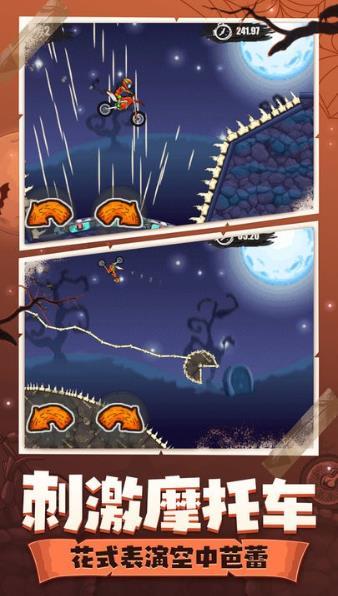《登山摩托车6万圣节》融入浓厚的节日氛围,赛道布局充满创意,巧妙运用南瓜等万圣节元素装饰摩托车外观。地形起伏剧烈,大幅提升了山地骑行的难度与观赏性。游戏中提供超过六千套风格怪诞的骑行服饰,玩家可在下坡过程中施展高难度特技动作,享受心跳加速的极限操控。