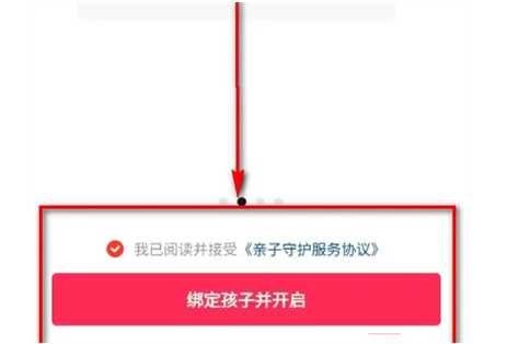 4.页面跳转进入后,在底部的“亲子守护服务协议”前面点击小圆圈进行勾选同意,再点击“绑定孩子并开启”的按钮即可。