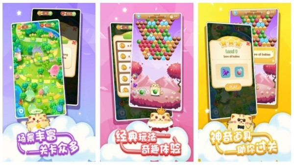 专为喜爱猫咪的玩家打造的《开心萌猫泡泡龙》,以萌趣小猫为核心主题,游戏中登场十余种造型各异的可爱猫咪形象,并融入大量猫玩具元素的关卡场景,充满童趣与温馨感。多彩圆润的泡泡与限定时间、指定种类等任务机制结合,构成上百个富有创意的挑战关卡,等待玩家逐一攻克。