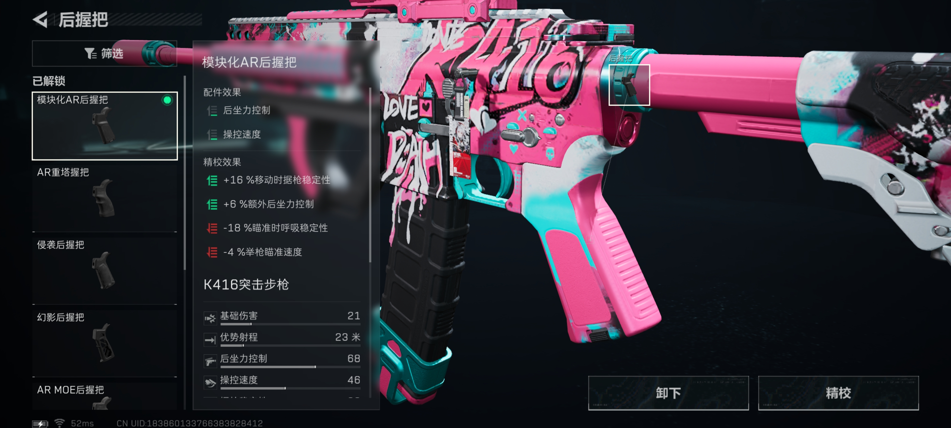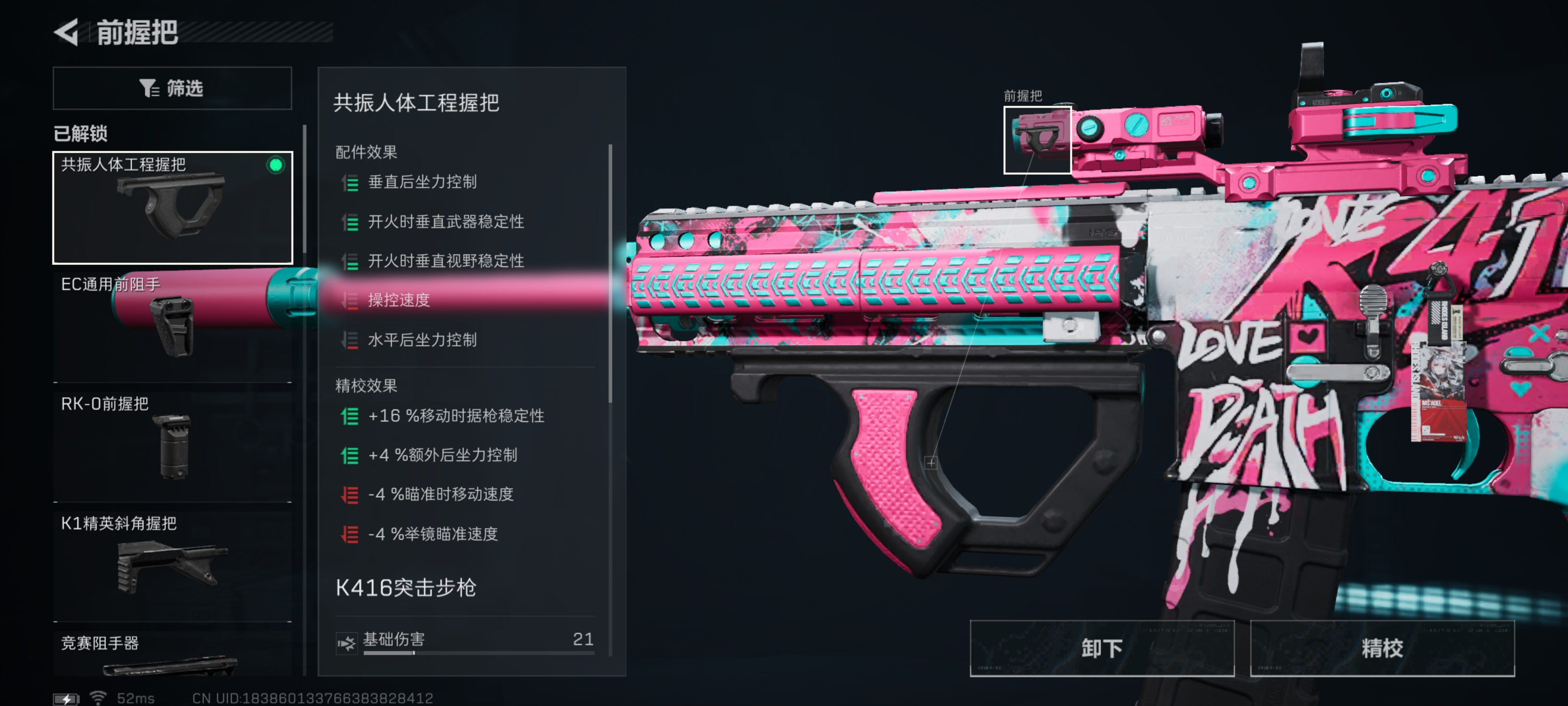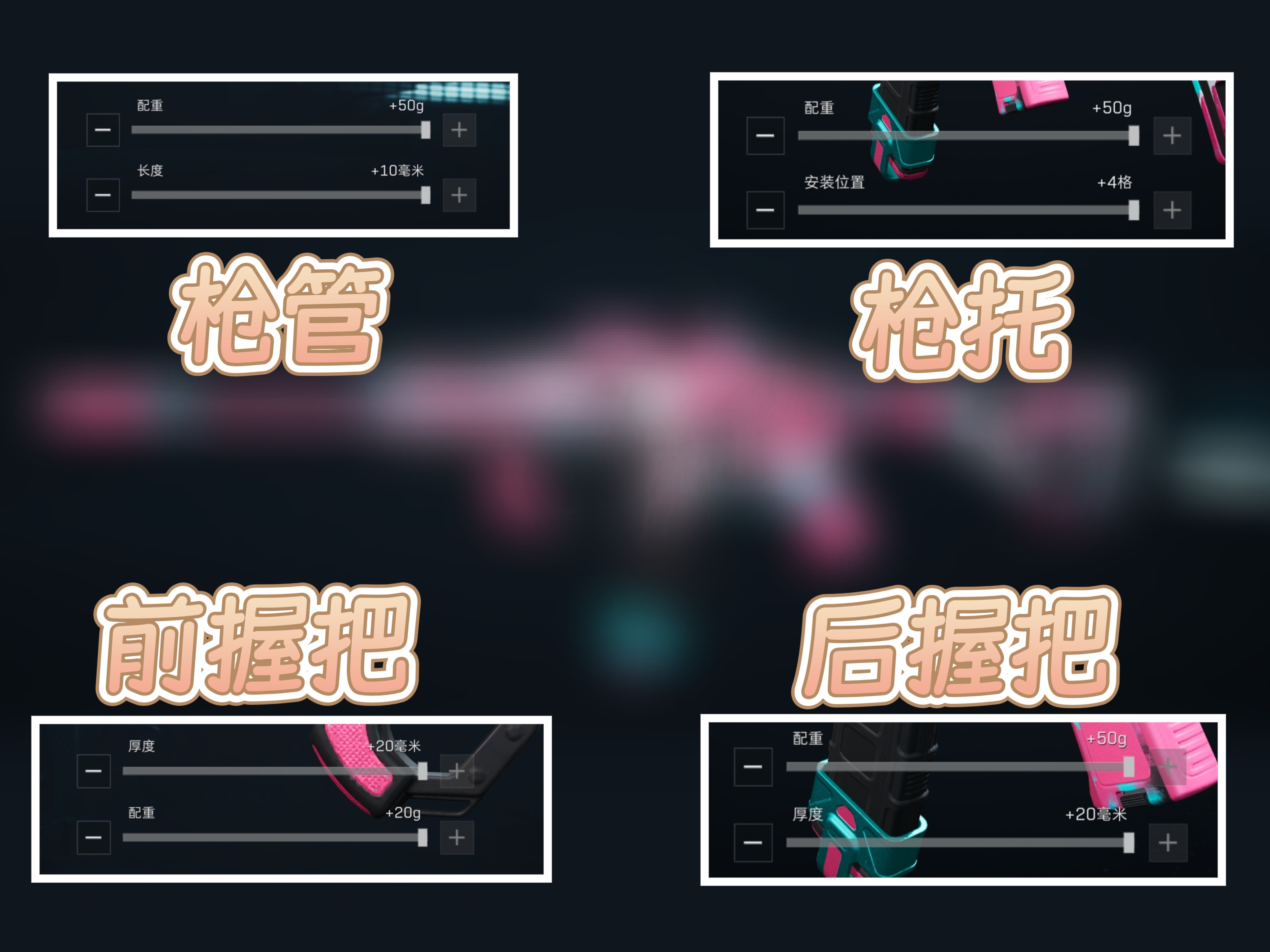 枪管、前握把、枪托、后握把的精校全部向右拉满,虽然会减少枪械的操控速度,但是可以通过枪管安装DD蟒蛇护目片以及镭射来提升枪械操控速度,从而达到一个开枪既稳开镜更快的一个标准。