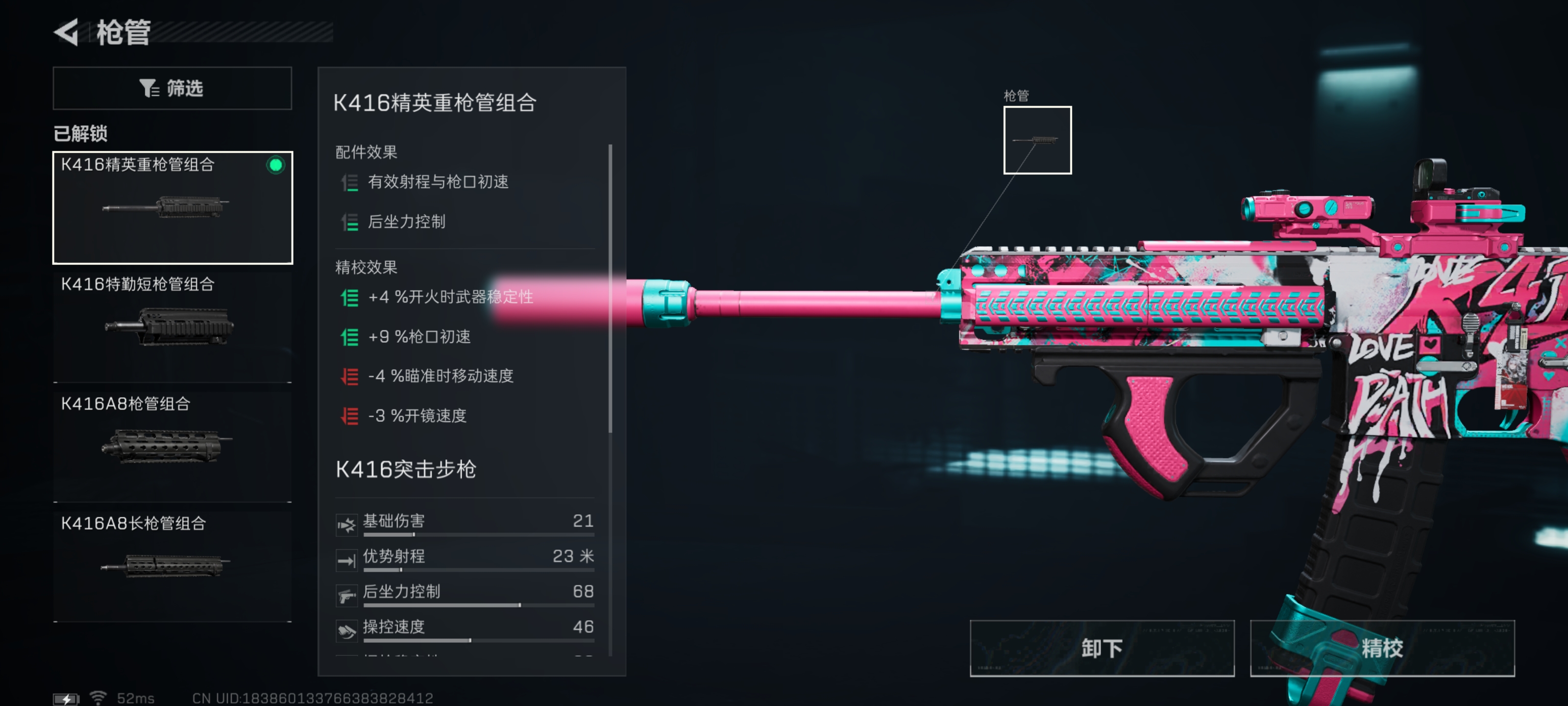 枪管选择K416精英重型枪管组合。这个枪管搭配上轻语战术枪口可以小幅度提升k416的射程以及枪械稳定性。