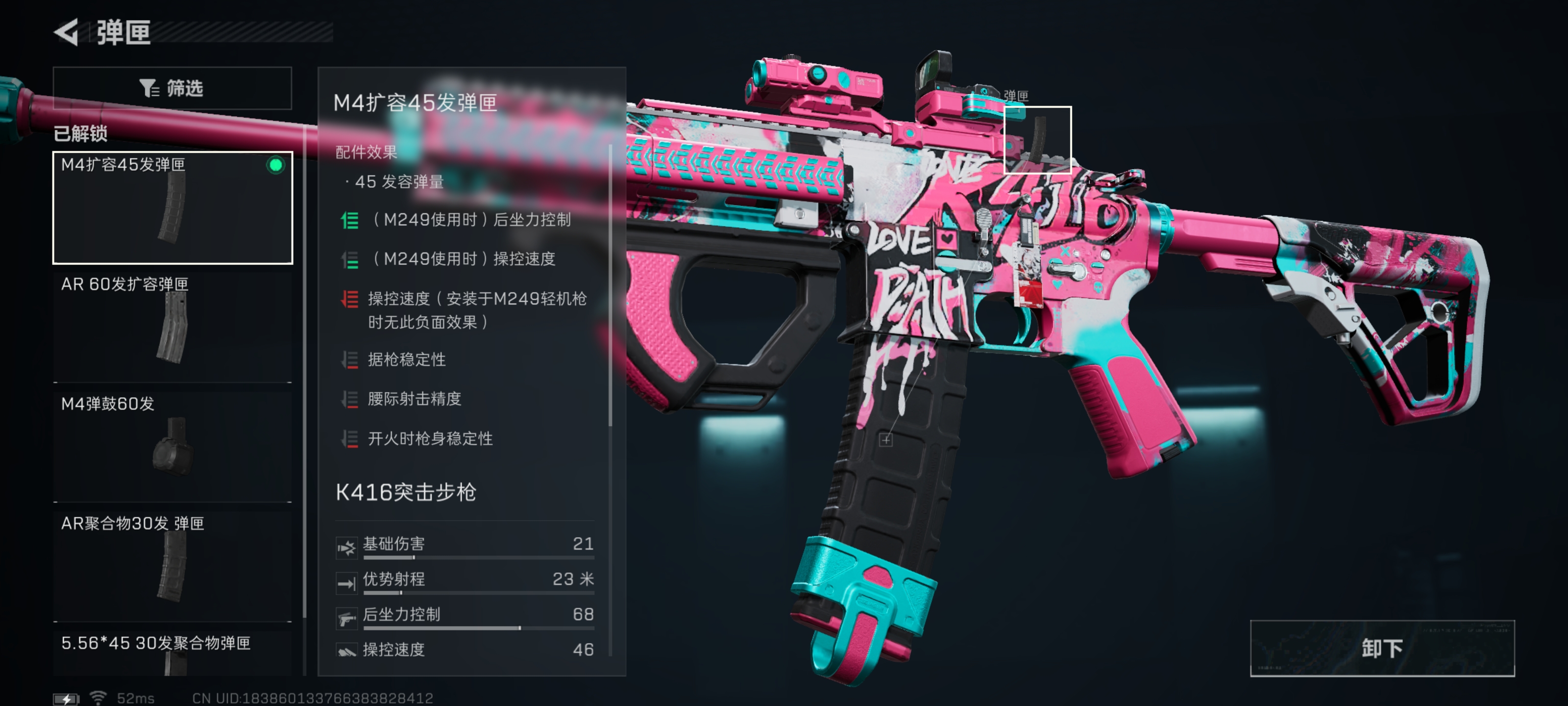 弹夹选择M4扩容45发弹匣。在k416的高射速的情况下选择扩容较高的可以提升枪械的续航能力。