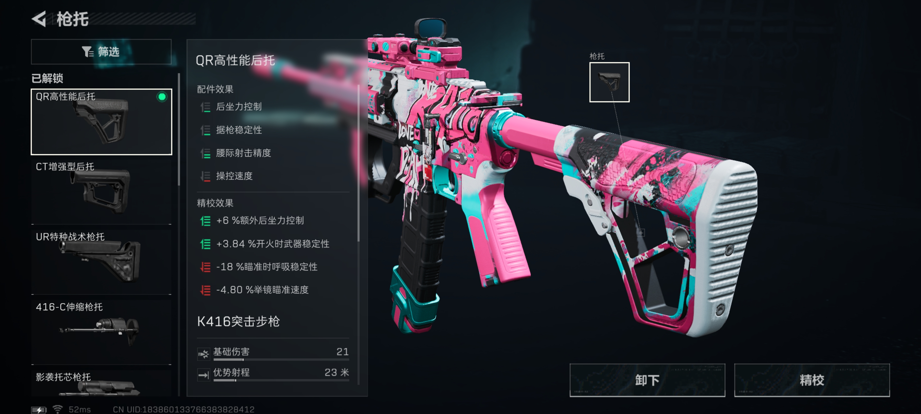 枪托选择新版本的QR高能性后托。对比上次旧版本的配件,这个枪托在尽可能的情况下尽力减少枪械的操控速度,以及提升枪械的稳定性以及腰际射击精准度。下面是枪械精校: