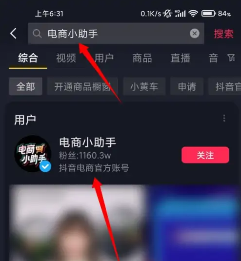 在搜索结果列表中,点击电商小助手的官方账号进入。