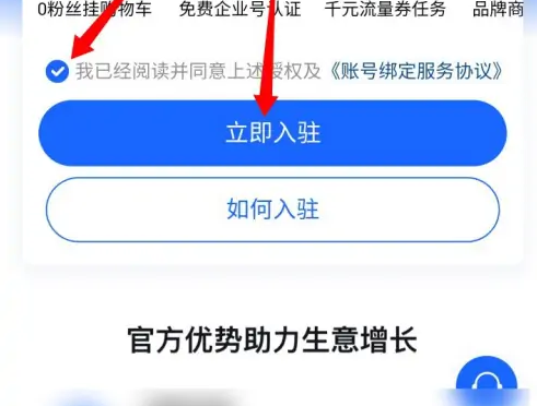 勾选协议点击立即入驻的选项,即可开通商品橱窗挂小黄车。
