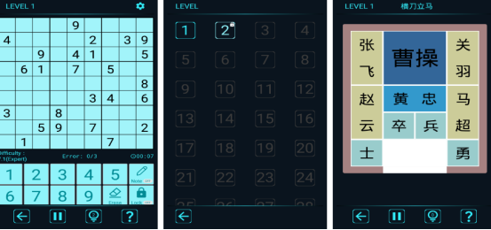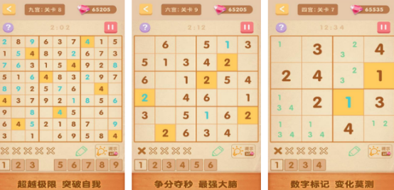提供八种不同类型的逻辑谜题供玩家破解,包含标准数独——在9×9网格中填入1到9的数字,确保每行每列不重复;华容道则通过滑动方块开辟通路;另有改良版扫雷等新颖玩法,丰富解谜体验。