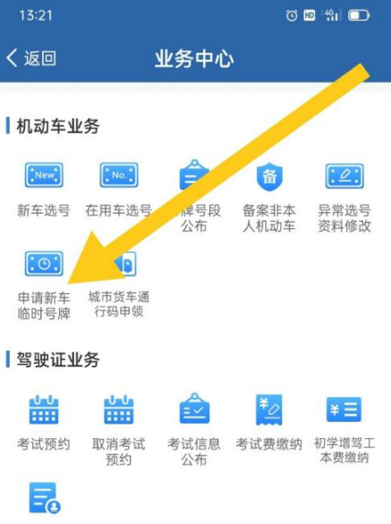 在“业务中心”页面,找到“机动车业务”,点击“申请新车临时号牌”。