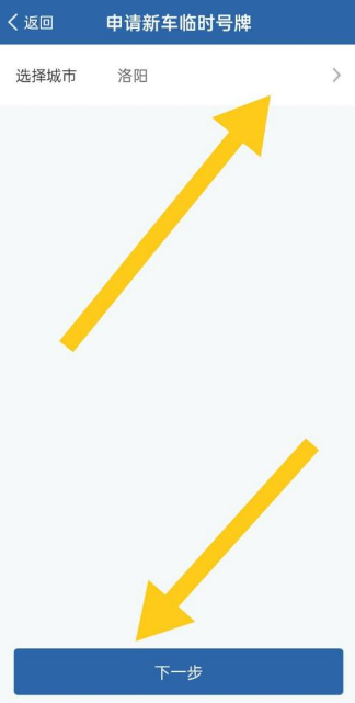 在“申请新车临时号牌”页面,选择城市后,点击“下一步”。