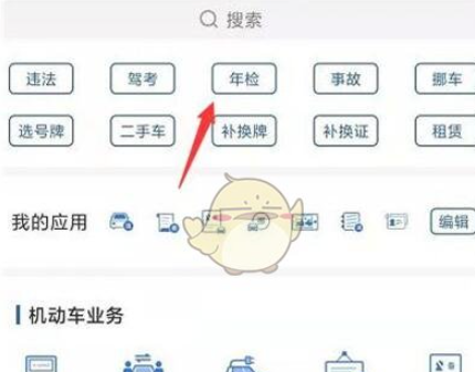 2、在更多页面的*上方能看到一个小的【年检】标签,我们点击这个标签进入到相关界面。