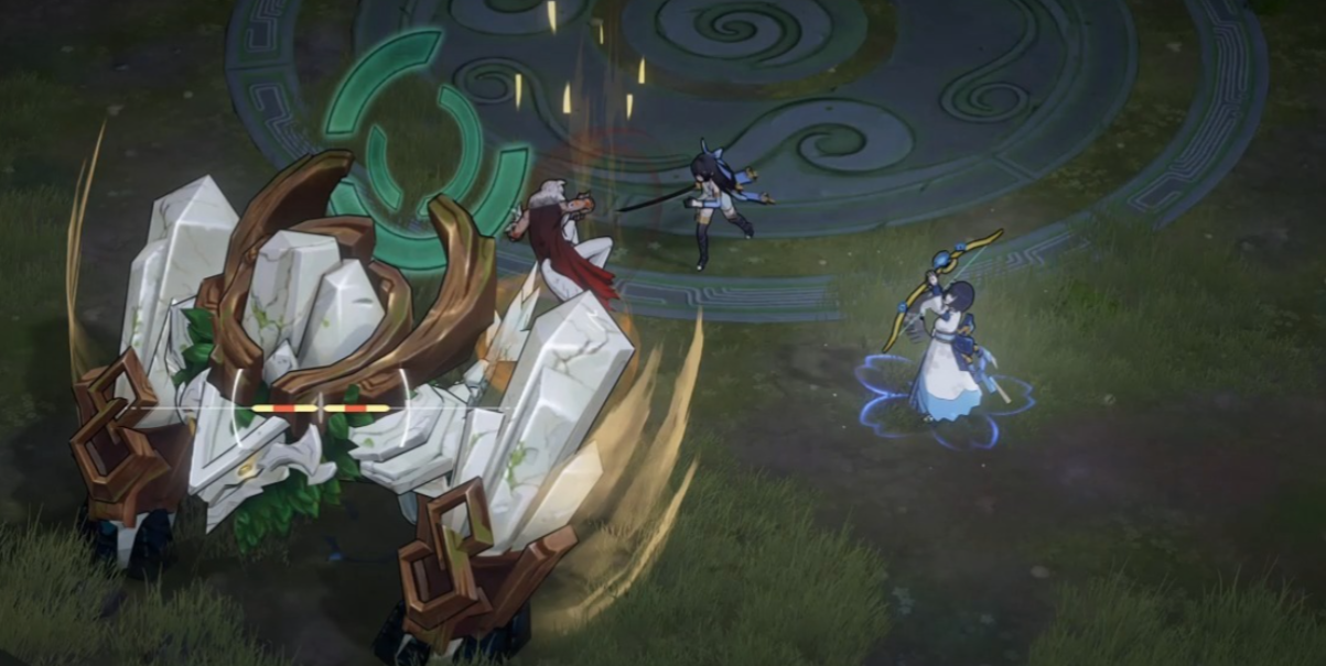 游戏的玩法属于动作类共斗类型,玩家在战斗中可以组成三人小队参与挑战,由于团队协作分担了操作压力,所以整体操作难度不高。玩家们只需操控小队中的一位角色,即可配合队友开始挑战,这里很推荐玩家们使用辅助角色,辅助角色无需复杂的输出操作,只需通过技能为队友提供治疗、护盾或增益效果,保证上场角色的血量稳定,就能为团队发挥重要作用。