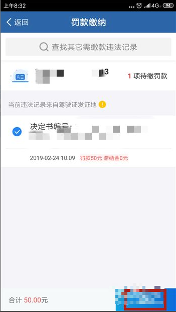 接下来可看到显示的当前违章,选择要缴纳罚款的违章并点击【缴款】。