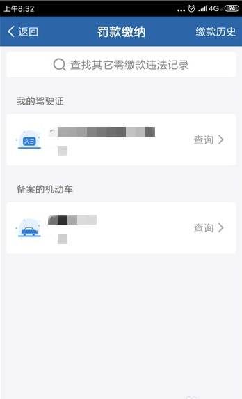 在罚款缴纳中需要选择驾驶证或者机动车,这里都是可以查询到的,任意点击一个。