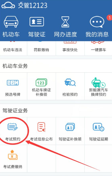 接着,我们在交管12123首页面找到“考试预约 ”按钮,点击打开考试预约页面 。