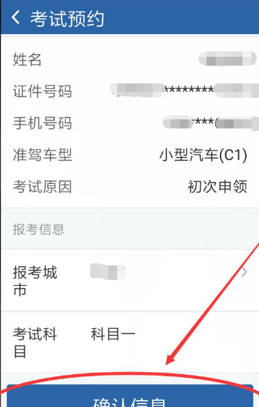 还没考科目一的,我们就会自动来到科目一信息确认页面,我们确认信息无误之后,点击*下方的“确认信息 ”按钮 。