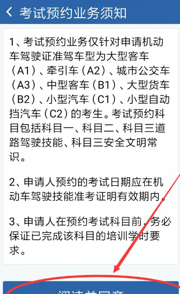 在进入日期预约选择页面之前,系统会弹出一个“考试预约须知 ”的注意事项,我们直接点击“阅读并同意 ”按钮 。