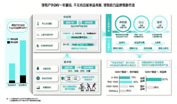 Z世代的新消费特征为品牌提供了新增长动力。《报告》显示,猛犸象、迪桑特、可隆、萨洛蒙、凯乐石、骆驼、伯希和等1300多个户外品牌在得物App通过新品、新玩法快速打开市场,并推动热度向长期销量转化,完成从爆款到经典的代表作沉淀。2025年至今,得物户外行业GMV同比去年增长了100%。