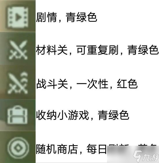 二、关卡图标,总共就5种关卡(硬是能被华子搞出来千军万马的情景,也是挺厉害的),3种颜色,青绿色的剧情+小游戏+材料关,黄色的商店,红色的战斗关卡对比材料关难度稍微偏高那么一点点;判断该关卡有没有打过的小技巧,看右上角的小标标(但是真的很小很小很小,尤其是一整张大地图,然后又很密集的放在一起的时候,眼睛真的要瞎掉了)