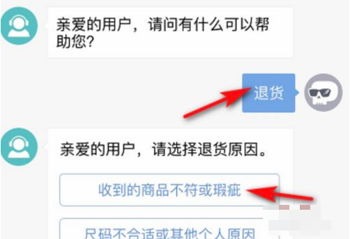 第四步:进入客服对话页面,在对话框输入退货并选择退货原因,如下图所示