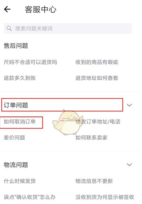 4、在“客服中心”中 - 找到“订单问题”- 点击“如何取消订单”。