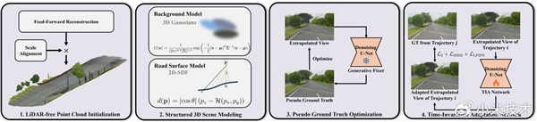 他们还用2D-SDF路面模型嵌入几何先验,保障外推视角几何一致性;引入“伪真值”监督修复外推瑕疵;借时序不变适应网络消除光照等时间相关干扰。
