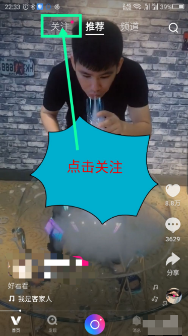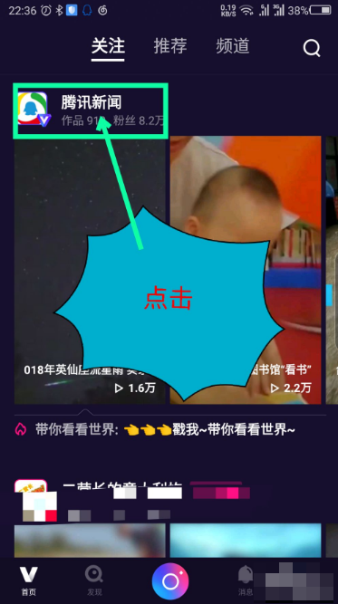 打开首页界面后,点击顶部左边的关注选项。操作如截图所示