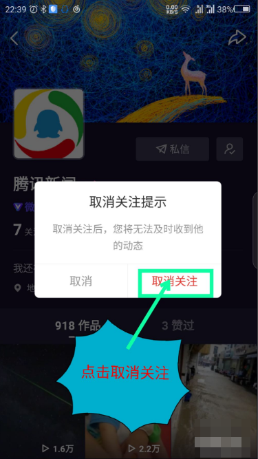 弹出一个取消关注的提示窗口,点击右边的取消关注。如图所示