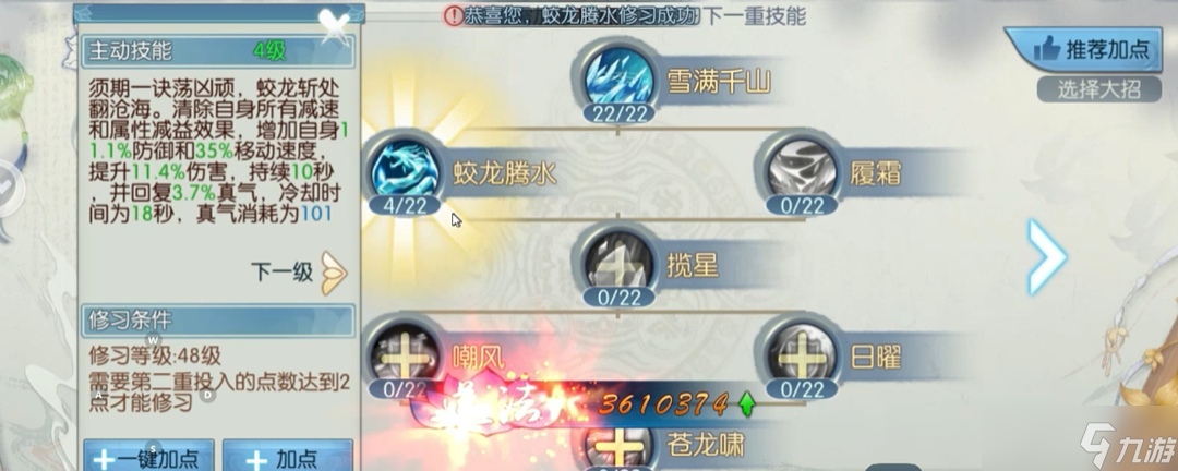 剩下的48个技能点建议在月华、横槊和履霜中选两个加满。月华主要提升暴击属性,适合追求输出的玩家;横槊增加躲闪效果,更适合需要生存能力的场合;履霜则是兼顾伤害与位移的多功能技能。如果只把履霜当作位移或打断技能用,点1级就够。被动技能的天书建议选择暴伤加成和暴伤减免,这两个属性对逐霜的实战表现帮助最大。最后剩下的点数可以点1级醉月飞觞用来清除负面状态,或者全部投入嘲风增加抗性。
