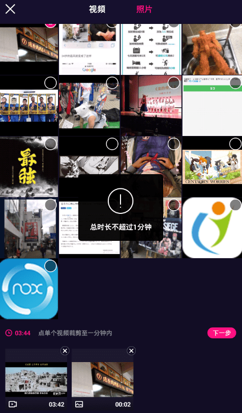 2、打开手机本地视频上传界面后,点击视频素材右上角的按钮勾选好需要合成的视频和照片,就可以点击“下一步”按钮进行合成。