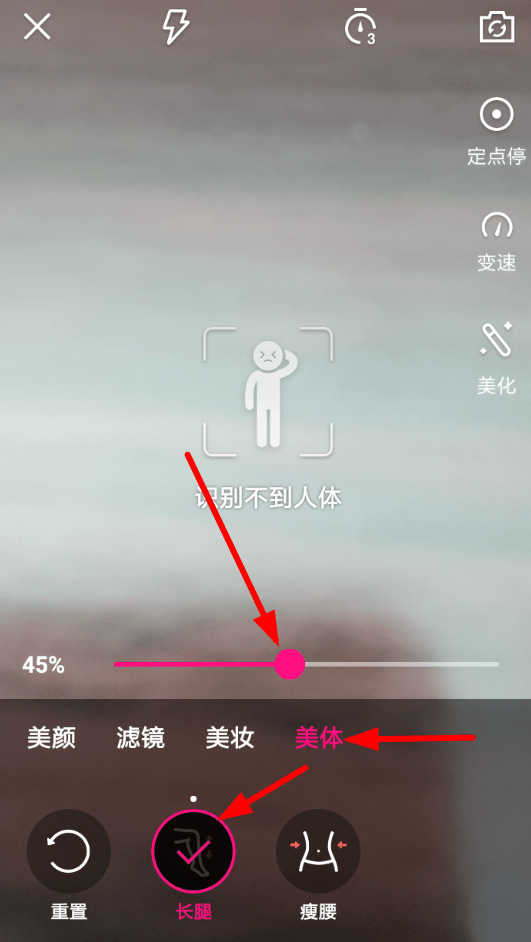 2、当大家进入美化列表后,从中选择“美体”的分类,就可以在下方设置“长腿”*了,设置完毕后可以通过上方的进度条进行调整。