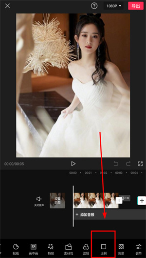 2、接着往左边滑动点击【比例】,将比例更改为1:1;