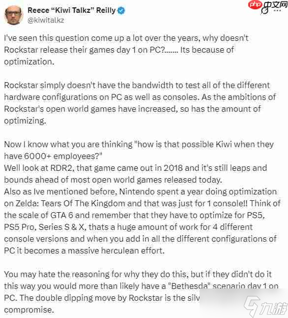 Kiwi Talkz表示:“R星根本没有足够精力,既做好主机平台的优化,还同时测试PC平台所有不同的硬件配置。随着R星开放世界游戏的规模不断扩大,优化工作量也随之增加。”