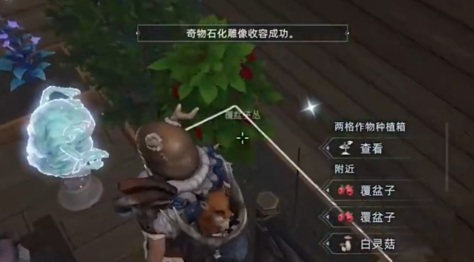 成功击败后boss会掉落石化雕像,但此时它还未收容成功,我们需要在其周围摆放上覆盆子、鼠尾草、白灵菇、亚麻花、蓝莓菇、琉璃苣这六种植物,需要注意一定要将这些植物种植在种植箱中,否则是不会起作用的。