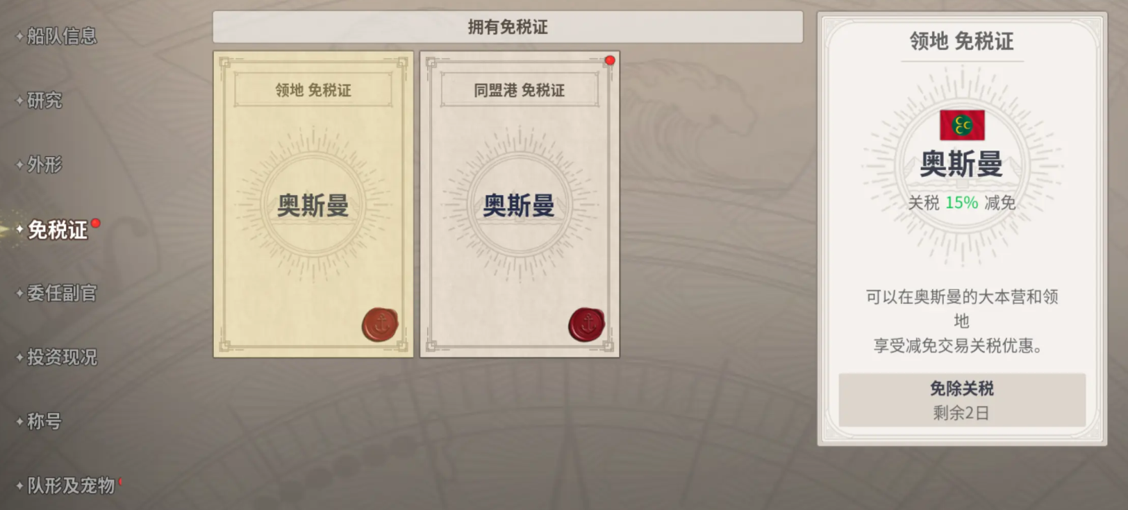 免税证是在贸易之际能享受关税减免的凭证,能帮助提督在贸易之中节省成本,大家可以在各国的王国中领取,每一张免税证的有效期是3天,领取的时候需要消耗蓝钻,由于在本国境内能享受到减免优惠,所以更加建议大家去拿其他国家的免税证,尤其是有着关键贸易品、或是常用城市所在国家的免税证,需要注意该证分为两种类型,一种是领地类可以在发放国的大本营和领地使用,另外一种是同盟港口类,可以在发放国的同盟港口使用。