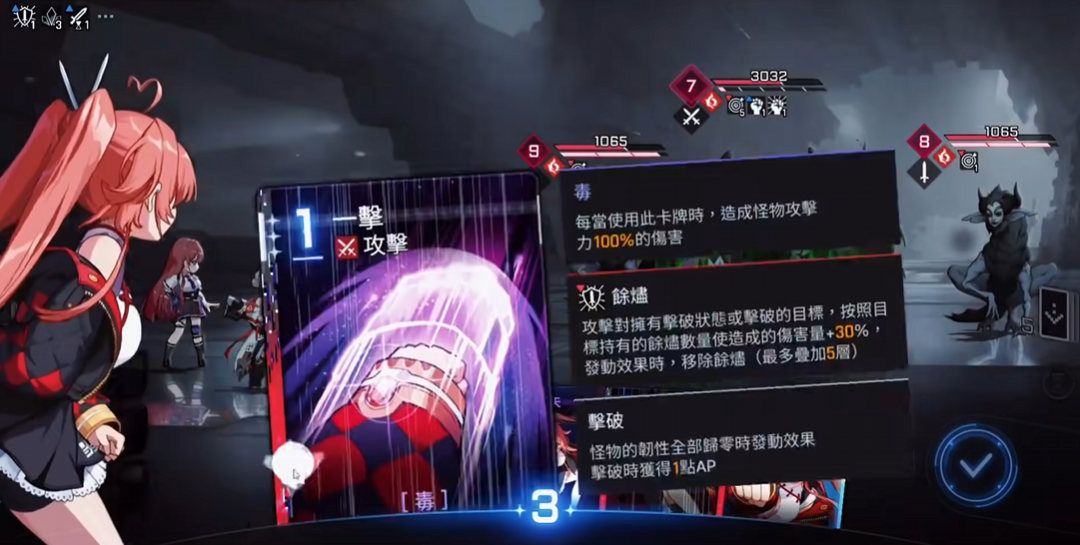 这个角色擅长以火力压制对手,是群攻型的输出角色,能力也非常出众。她的卡组搭配上,有3张基础卡牌可用,2张是攻击卡,分别12费,还有一张是护盾卡。另外她还拥有一个2费的特殊攻击卡-锚点,这个卡附加粉碎效果,处于护盾状态下的对手会受到额外20%伤害,核心技能就是0费可用的“锚点追踪”,可以直接从牌库,或目的里面制定卡牌直接回收到手牌,搭配“灵光一闪”使用,在单轮就能提高50%暴击率,很大程度上增强了她的爆发潜力。从卡牌结构明显可以看出,她是个高爆发性决斗者,善于在短时间打出巨额伤害。